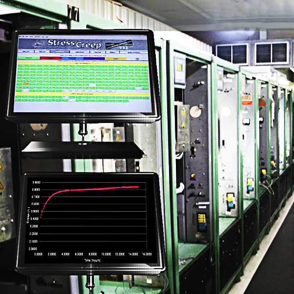 Kriech- und Zeitstandversuche werden nach entweder ASTM E139 (Kriech- und Zeitstandversuche an glatten Stäben) oder nach ASTM E292 (Kerbversuche) bei Temperaturen bis zu über 1200°C durchgeführt. Temperaturen und Kriechmessungen werden kontinuierlich überwacht und digital aufgezeichnet, um höchste Genauigkeit zu gewährleisten. Beim Kriechversuch ist es möglich, Dehnwerte 120 mal pro Stunde aufzuzeichnen. Diese Informationen werden verwendet, um Temperaturtoleranzen während des Kriechversuchs beizubehalten sowie einen Temperaturbericht für jede abgeschlossene Prüfung zu ermitteln. Die Prüftemperaturen werden vom zentralen Überwachungssystem kontrolliert.